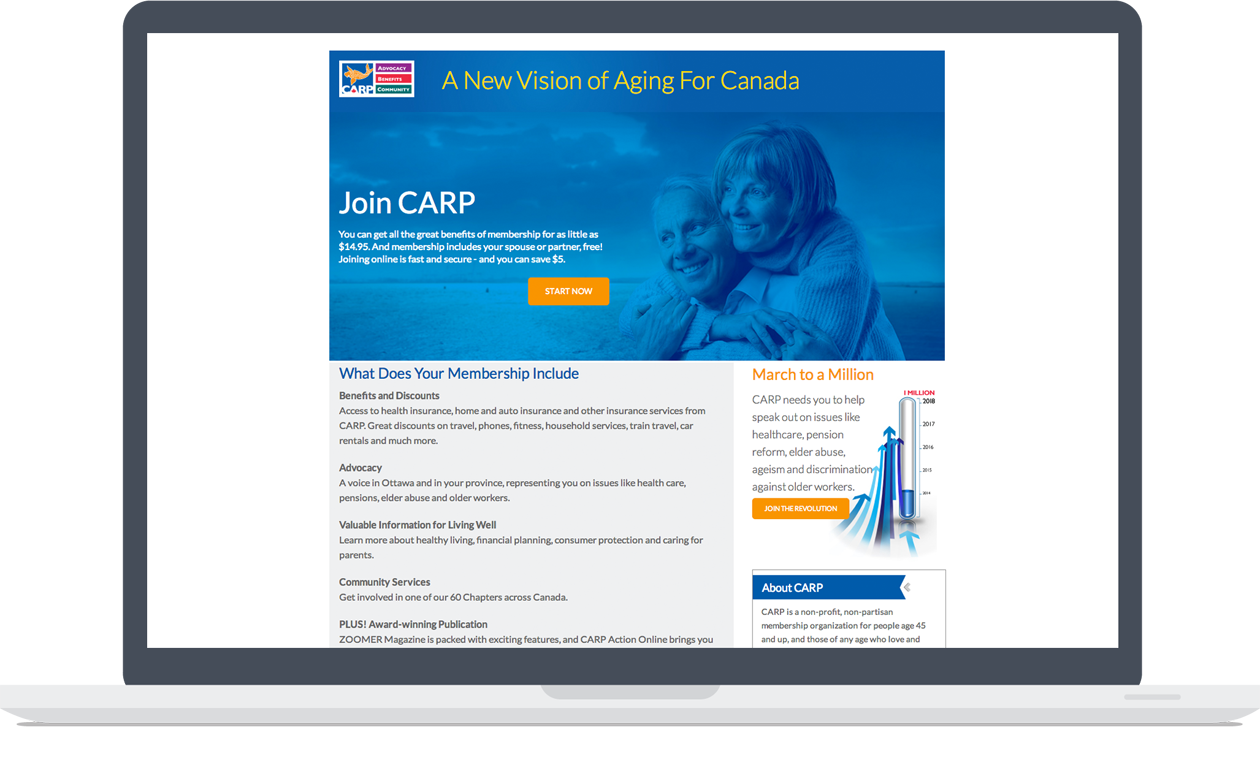 CARP is a non-profit, non-partisan membership organization for people age 45 and up, and those of any age who love and care for them. CARP is dedicated to enhancing the quality of life for Canadians as we age. We lead positive social change and deliver value to members through information, advocacy and service.